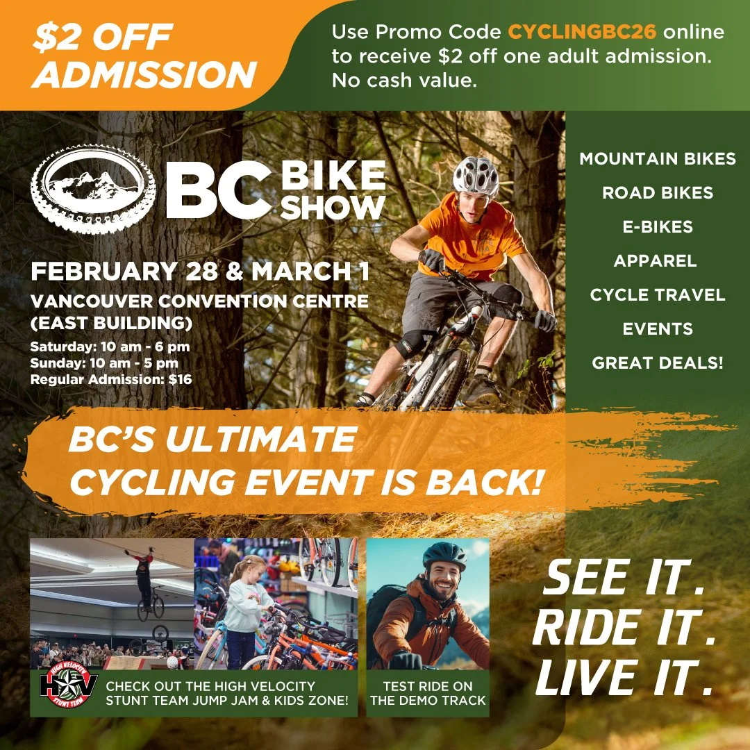 Use promo code; CYCLINGBC26 online at BCBIKESHOW.COM to get your discount.
